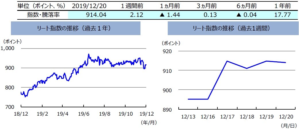 先週の豪州リート指数は、上昇しました。17日に公表されたRBAの12月開催分の理事会議事要旨で、来年2月にも追加利下げを行う可能性が示されたことなどから、相対的に利回りの高いリートは上昇しました。その後、週末にかけて値動きは小幅にとどまりました。
