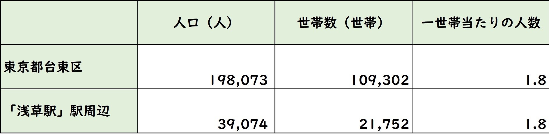 駅周辺に絞って見ていこう。「浅草」駅周辺の一世帯当たりの人数(図表6)は1.8人と、台東区の平均と同等。「浅草」駅周辺も、単身者層に選ばれる地域であることがわかった。「浅草」駅周辺の1K・1DKの平均家賃は7.78万円。都心からの距離から考えるとリーズナブルであることも、単身者から好まれる理由だろう(平均家賃はいずれも、公益社団法人全国宅地建物取引業協会連合会調べ12月24日時点)。