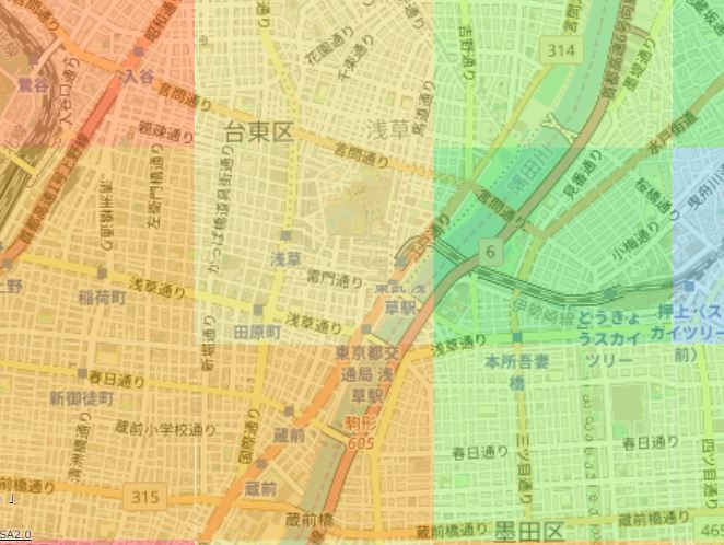 2指標を合わせた総合危険度では、「浅草2丁目」や「花川戸2丁目」を除き、危険度の低い「1」の評価。特に浅草寺雷門より南側のエリア、住所でいうと「駒形1~2丁目」「寿1~3丁目」「雷門1~2丁目」付近は、危険度は低いと評価されている。