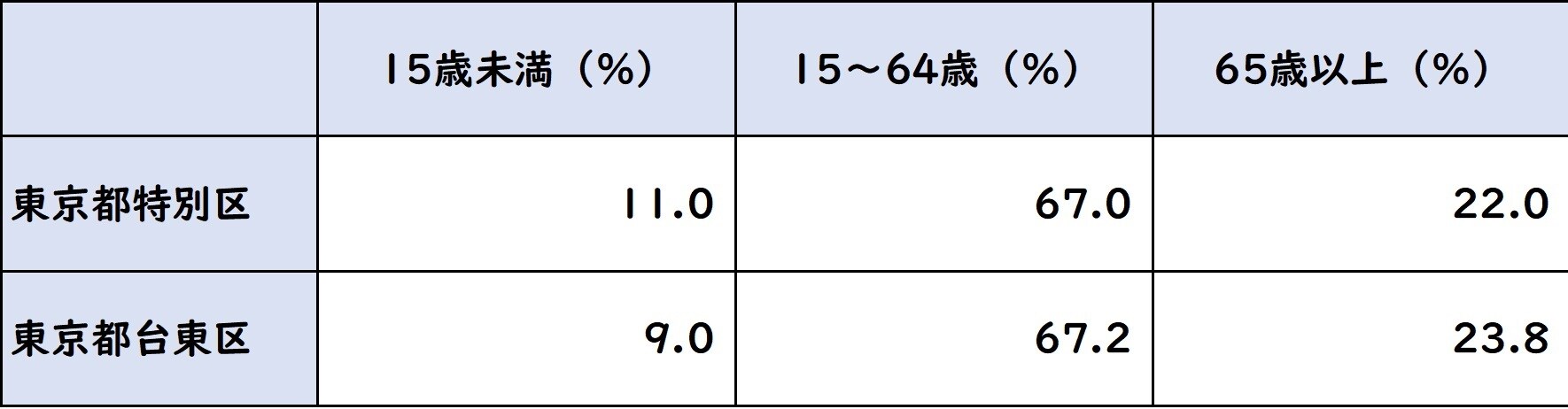 そのような台東区にどのような人が住んでいるのか、人口構造と世帯の状況を見てみよう(図表2、図表3)。人口構造で目立つのが、15歳未満の少なさ。23区の平均を下回る9.0%である。また単身者世帯数は、23区平均を上回る56.3%。台東区は、ファミリー層よりも単身者層に好まれる地域のようである。