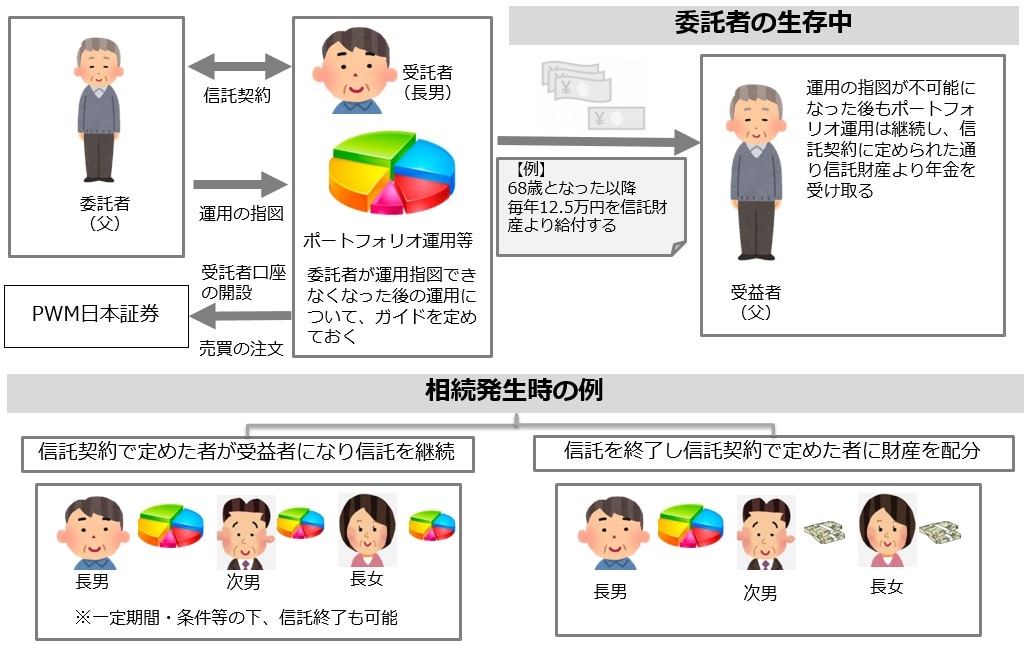 当初の受益者から次世代以降の方に受益権が承継できます。財産分割を指定する遺言と同じ機能があります。さらに、子、孫へと継承先を指定できる跡継ぎ遺贈の信託があります。