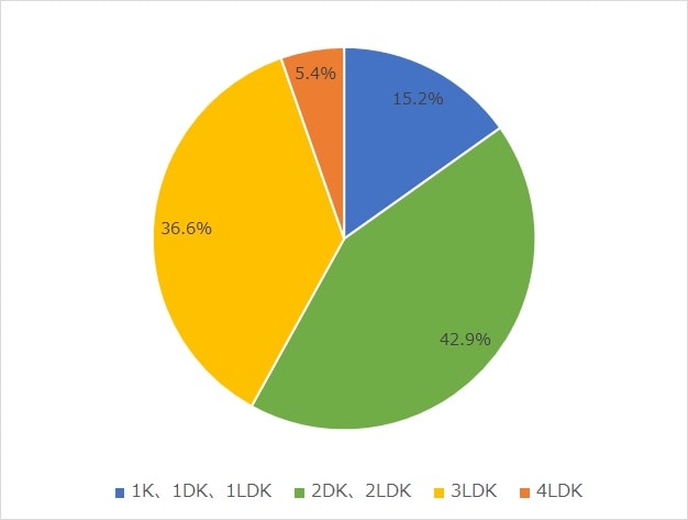 次に中古マンションの平均取引価格(図表2)と、その種類(図表3、4)を見ていこう。武蔵小杉の平均取引価格は4211万円に対し、豊洲は5408万円と、800万円近くの差がある。単身者向けの1K、1DK、1LDKの割合が、武蔵小杉は25%強なのに対し、豊洲は15%となっており、その差が価格差となって表れていると考えられる。またここからも、単身者もファミリー層も取り込む武蔵小杉と、ファミリー層に強い豊洲、という性格の違いが垣間見られる。