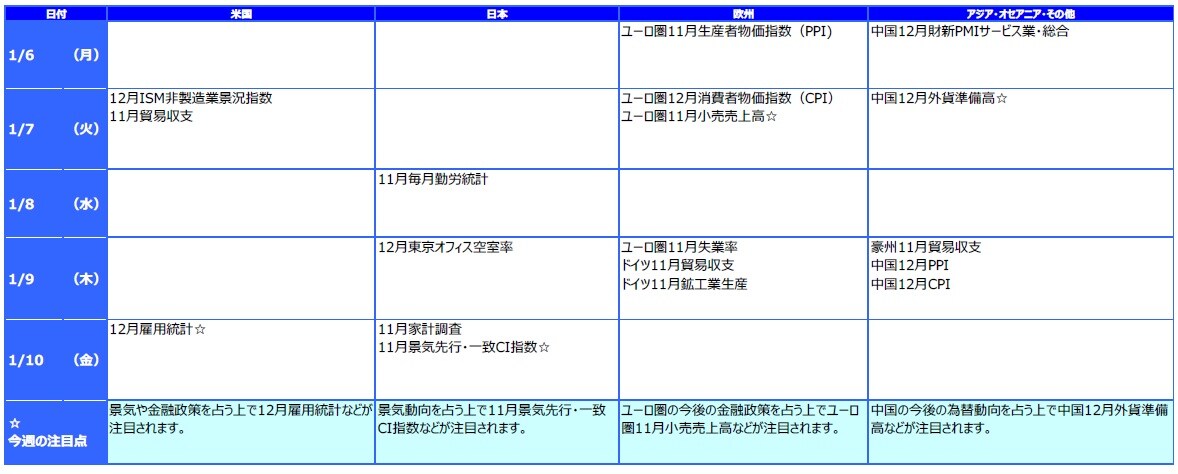 米国株式市場は、米中貿易協議の進展期待や中国の金融緩和策などを好感して堅調に推移し、主要指標は一時最高値を更新しました。その後は米軍がイラクの首都バグダッドでイラン革命防衛隊の精鋭組織の司令官を殺害し、中東情勢が悪化するとの警戒感が高まったことや、12月の製造業景況感指数が市場予想に反して前月から低下したことなどから下落しました。週間ではNYダウはほぼ横ばいとなりました。日本株式市場は、円高を嫌気したことや、年末年始の休場を控えてポジション整理の動きも出て、日経平均株価は0.76%下落しました。欧州株式市場は、中東情勢が悪化するとの警戒感などからFTSE100指数は0.29%、DAX指数は0.88%下落しました。中国株式市場は、中国人民銀行(中央銀行)が預金準備率を6日から0.5%引き下げると1日に発表したことなどを好感して香港ハンセン指数は0.80%、上海総合指数は2.62%上昇しました。