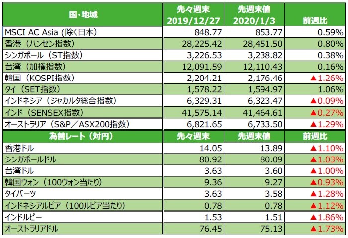 (注4)前週比は2019年12月27日から2020年1月3日まで、前月末比は2019年12月31日から2020年1月3日まで、前年末比は2019年末から2020年1月3日まで。