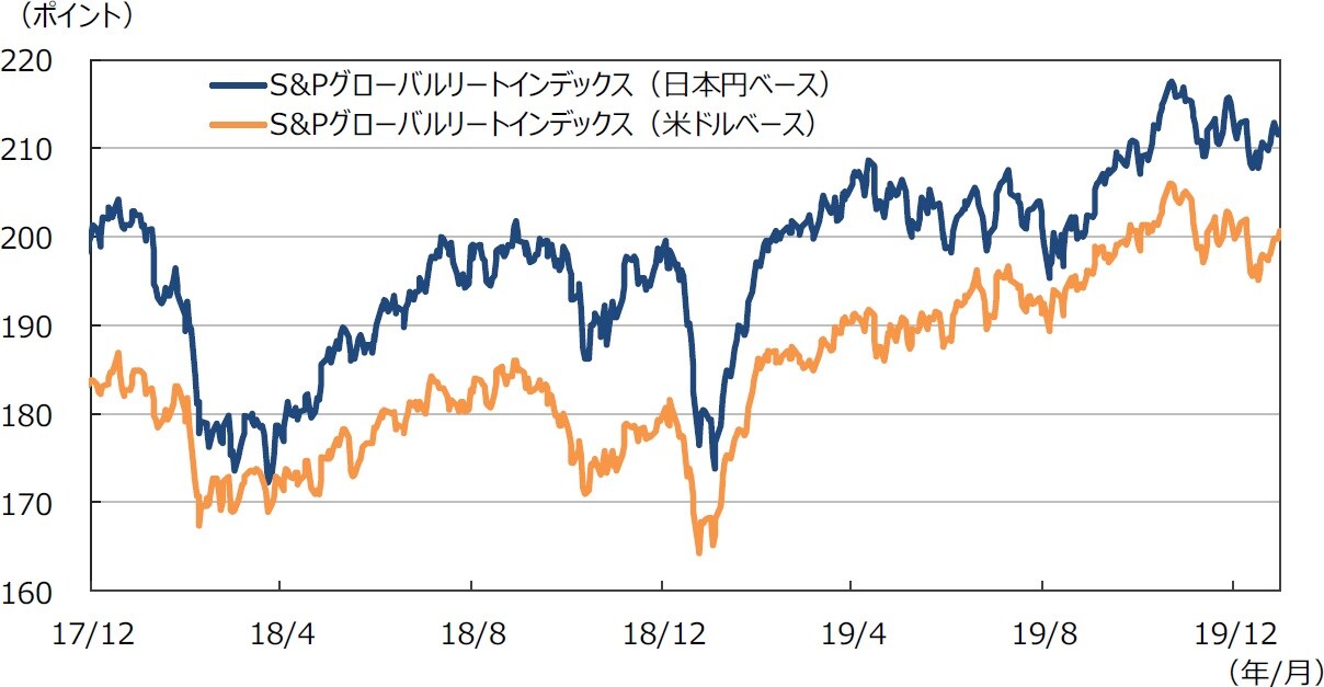 グローバルリート市場(米ドルベース)は、米中貿易協議において第一段階の合意に達したことなどからリスク選好度が強まり長期金利が上昇したことなどから、リート市場は下落しました。中旬以降、一時持ち直す場面があったものの月末にかけてもみ合いとなり、月間では▲0.66%の下落となりました。一方、円ベースの月間変化率では、米ドル円レートが円高で推移したことから、同▲1.42%の下落となりました。