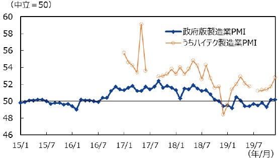 12月の製造業PMI(政府版)は50.2と、市場予想の50.1をやや上回り、2カ月連続で50超えとなった。米中協議の第一段階が12月13日に合意に至ったことで米中間の緊張が緩和したことが景気センチメント改善の主因である。更に、1月24日に始まる春節休暇を控え、消費財の生産が前倒しで行われたことも製造業PMI50超えに貢献した。しかし第二段階での合意が難しいこと、前倒しの反動が出てくること、を想起すれば、1月または2月の製造業PMIは再び50割れになりそうだ。