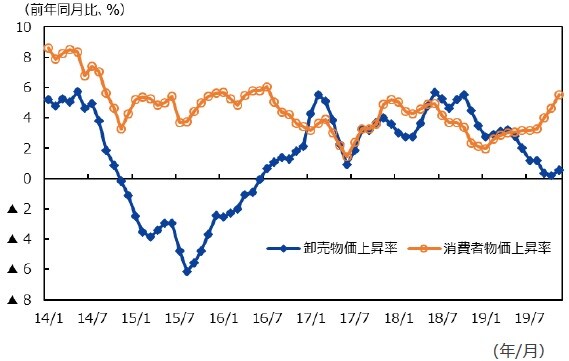 11月の消費者物価上昇率は、前年同月比+ 5.5%と、10月の同+4.6%から加速、ターゲット (4±2%)の中央値を超えた。内訳を見ると、玉 葱など食料品価格の上昇が主因である。一方、 11月の卸売物価上昇率は前年同月比+0.6% と、10月の同+0.2%から加速したものの、低位 で安定している。