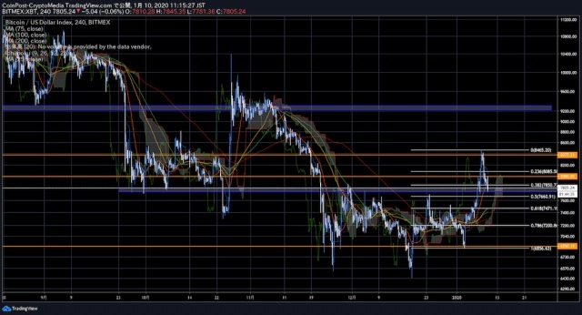 7800ドルにはサポートラインがあり、反発の見込めたラインだが、割り込んだ場合は半値戻しの7,650ドル、61.8%の7,470ドル付近まで見る必要がある。