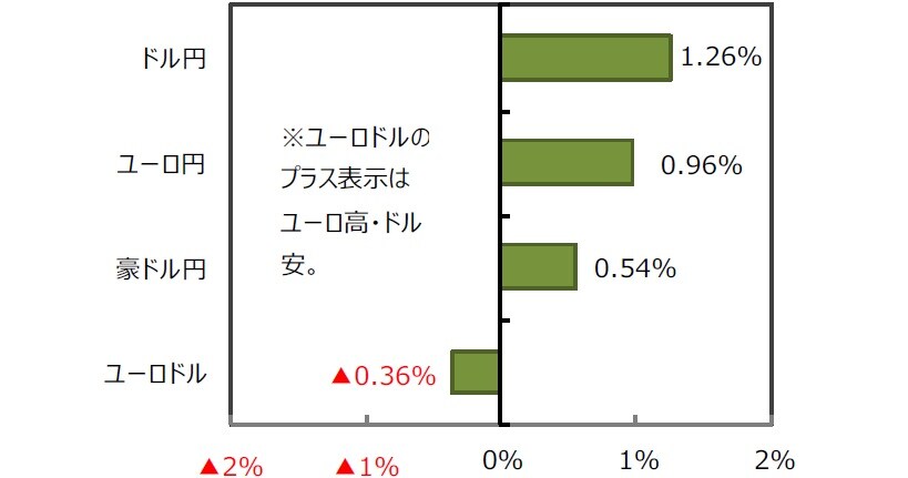 中東の地政学リスクの高まりを嫌気して一時円高となりましたが、その後中東情勢への警戒感が後退したことなどを背景に円は、対米ドルで1.26%、対ユーロでも0.96%の円安となりました。