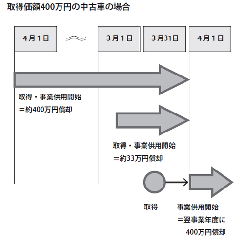 例えば、3月決算法人が3月に4年落ちの高級中古車を400万円で取得して即時に事業供用したとしても、減価償却費は、400万円×1/12=約33万円しか計上できません。前年の4月から事業供用していれば、約400万円が償却費として計上できるのですから、決算直前の3月に取得して事業供用することは、タックスメリットを大きく低下させてしまいます。やはり、早め早めにタックスマネジメントを考えておくことが重要なわけです。