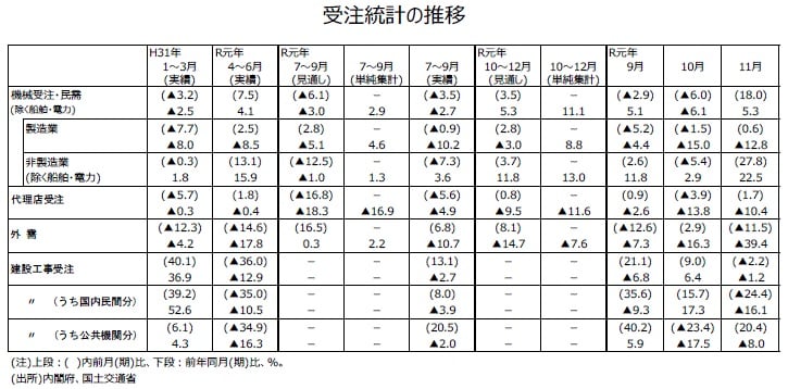 11月分機械受注(除船電民需)は前月比+18.0%と5カ月ぶりの増加