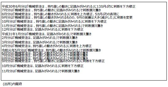 ●前回10月分では前月比が4カ月連続減少かつ3カ月移動平均が2カ月連続減少したことなどから下方修正され、18年12月分~19年3月分以来の「機械受注は、足踏みがみられる」という判断になった。今回11月分では前月比が5カ月ぶり増加かつ3カ月移動平均が3カ月ぶり増加となったものの、「機械受注は、足踏みがみられる」という判断は据え置きとなった。