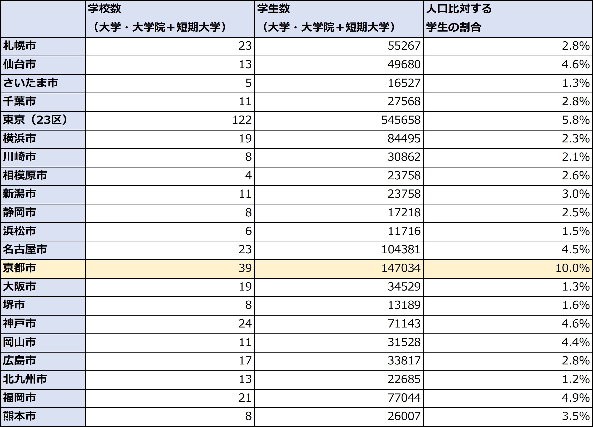 全国の政令都市と比較すると(図表5)、京都の特異性が際立つ。東京は別格として、京都には39もの大学があり(短期大学含む)、14万人もの学生が学んでいる。総人口に占める学生の割合は、東京よりも高く10%。住民の10人に1人は学生という街なのである。