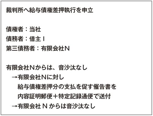 ということで、無事、借主Iの勤務先がわかりましたため、借主Iを債務者、有限会社Nを第三債務者として、管轄の裁判所へ給料差押えの申し立てをしました[図表4]。