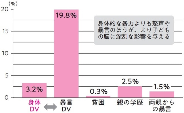 両親間のDVの目撃は「視覚野」を萎縮させますが、身体的暴力の目撃だと3.2%の萎縮だったのに対し、言葉の暴力に接してきた場合は19.8%の萎縮。約6倍もダメージが大きい結果となっています。