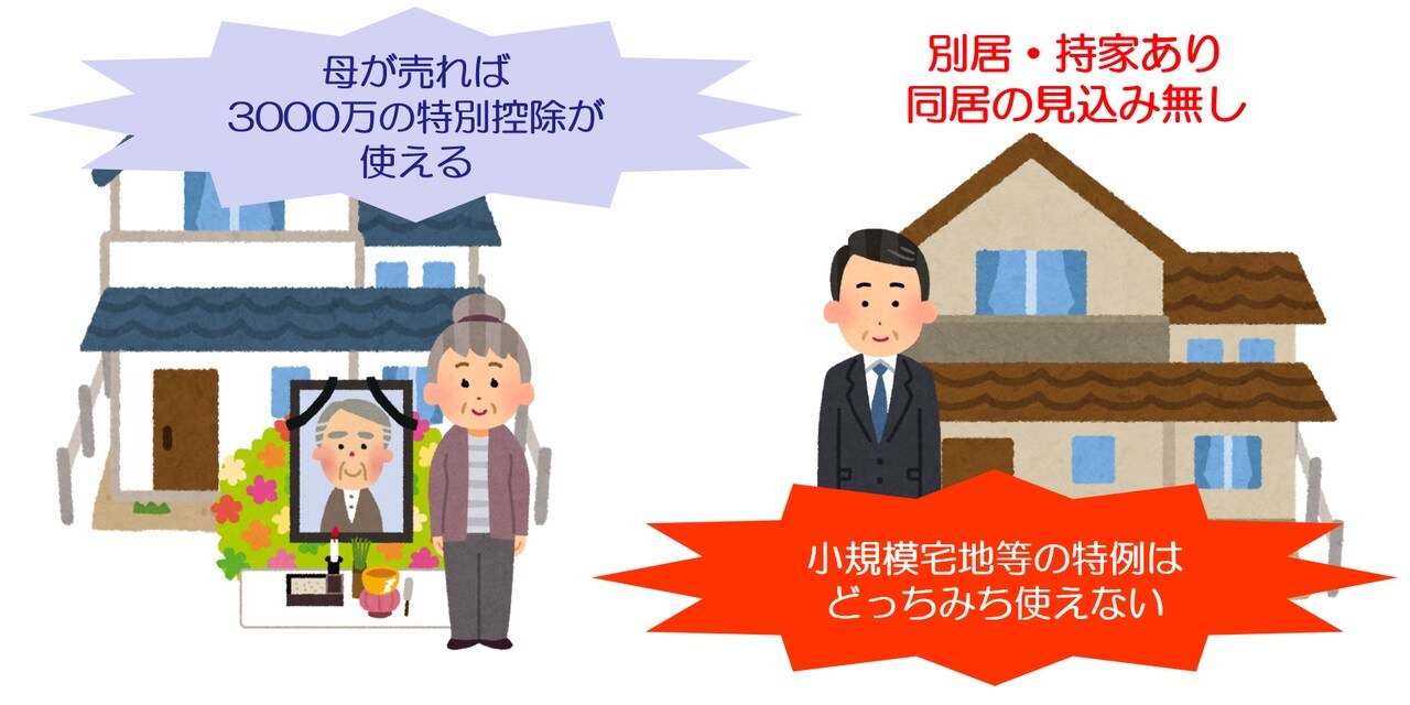長男は家なき子特例の条件をすべて満たすことになりますので、長男は母と同居していなくても、自宅を8割引きの金額で相続することができます。代わりに、3000万円の特別控除は使えません。売却したときに600万円分手取りが減ってしまいます。
