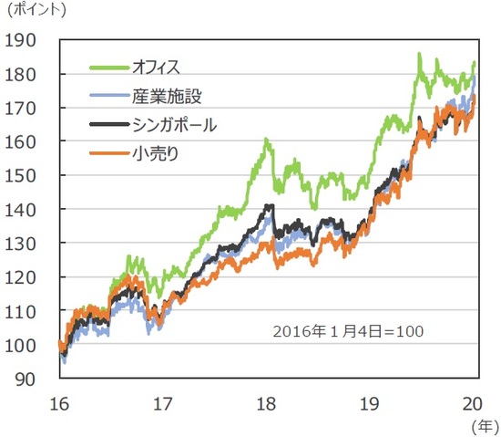 •シンガポールリートは、総じて堅調に推移しており、本年1月15日にリートインデックスは史上最高値を更新しました。時価総額で25.4%を占める「小売り」が高値圏で推移する中、同32.0%の「産業施設」の上昇が加速したためです。