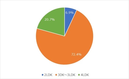また取引されている中古マンションの種類を見てみると(図表8)、調査時は単身者用の物件はなく、家族向けの3LDKが7割で、4LDKを含むと9割を超える。「新百合ヶ丘」周辺では昨今の不動産投資の主力である単身者向けのマンションはほとんど取引されておらず、平米数の広い家族向けの物件が主力となる。これは駅周辺の平均取引価格を押し上げている要因とも考えられる。