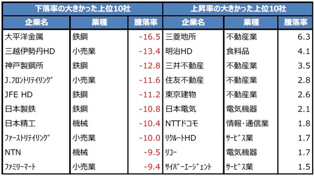 日経平均株価を構成する225社のうち、前述の期間中に株価が下落した企業は197社と、全体の約87.6%に達しました。これに対し、上昇した企業は27社と、全体のわずか約12.0%にとどまりました(株価が変わらなかった企業は1社)。下落率の大きかった企業10社と、上昇率の大きかった企業10社は図表1の通りで、業種は東証33業種の分類に基づいています。