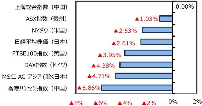 主要国の株式市場は中国の新型肺炎の感染拡大と経済への影響などを懸念して下落しました。米国株式市場は、中国の新型肺炎の感染拡大を受けて、米政府が中国全土への渡航警戒レベルを最高レベルに引き上げた他、米国企業の中国での業務休業の報道を受け業績懸念が強まり下落しました。週間ではNYダウは2.53%下落しました。日本株式市場は、3月期決算発表が続いていますが、その影響は限定的で、中国の新型肺炎の感染拡大を受けて、世界経済の減速懸念などを嫌気して下落しました。日経平均株価は2.61%下落しました。欧州株式市場は、DAX指数は中国の新型肺炎の感染拡大や低調な経済指標などを受けて4.38%、FTSE100指数は中国の新型肺炎の感染拡大や原油価格の値下がりなどを受けて3.95%下落しました。中国株式市場は、香港ハンセン指数が新型肺炎の感染拡大と経済への影響などを懸念して5.86%下落しました。上海市場は春節休暇のため休場でした。