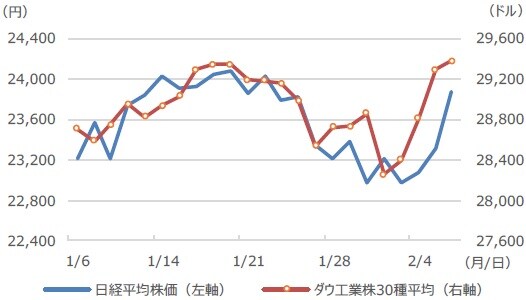 主要国の株価指数は、新型肺炎の感染拡大を受け、軟調な推移が続いていましたが、ここ数日は、反発の動きが確認されるようになりました(図表1)。日経平均株価は、2月6日の上げ幅が一時600円を超え、節目の24,000円に迫る場面もみられました。米国では同日、ダウ工業株30種平均、S&P500種株価指数、ナスダック総合株価指数が、そろって過去最高値を更新しました。