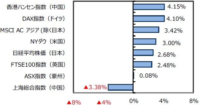 米国株式市場は、新型肺炎の感染拡大の過度な懸念が後退したほか、中国人民銀行が連日で大量の資金供給を続けたことなどに加えて、好調な米経済指標や企業決算も好感されました。週間ではNYダウは3.00%上昇しました。日本株式市場は、中国の景気刺激策への期待や対ドルでの円安、米国株高などを好感して上昇しました。日経平均株価は2.68%上昇しました。3月期決算発表が続いていますが、その影響は限定的でした。欧州株式市場は、中国の景気刺激策への期待や中国の対米関税税率引き下げの発表などが好感されました。DAX指数は4.10%、FTSE100指数は2.48%上昇しました。中国株式市場は、香港ハンセン指数が中国の景気刺激策への期待などから4.15%上昇しました。上海市場は延長された春節休暇明け初日に、新型肺炎の感染拡大と経済への影響などを懸念して大幅に下落しましたが、戻り歩調となり、3.38%下落しました。