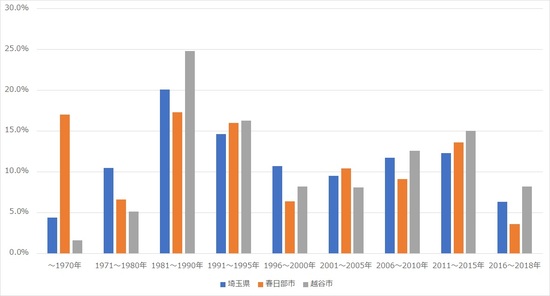 次に住宅事情を見てみよう。まず賃貸住宅の空き家率を見てみると(図表4)、両市とも埼玉県平均を下回る5%前。一方、賃貸住宅の建設年の分布(図表5)をみてみると、春日部市はバルブ期に建てられた物件のほか、築50年越えの物件が多く、築浅の物件は少ないことがわかる。越谷市は都市化が進んだ80年代以降の物件のほか、2000年以降、エリアの人気の高まりとともに物件が建てられていったことがわかる。今後、春日部市で物件の更新が進み、魅力的な賃貸物件が増えれば、人口増加にも影響を与えるかもしれない。