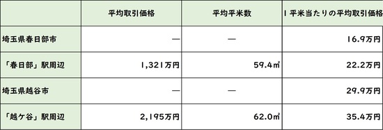 続いて直近の中古マンションの取引から、駅周辺の不動産マーケットの状況を見てみる(図表7)。両駅とも市の代表駅であることから、市平均を上回る取引価格となっている。また「春日部」よりも「越谷」のほうが10万円以上も平均取引価格が高いのは、都心からの距離に関係すると考えらえる。