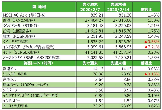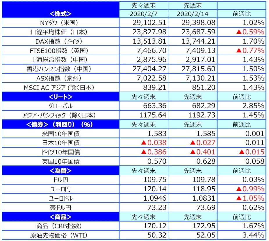 (注4)前週比は2020年2月7日から2020年2月14日まで、前月末比は2020年1月31日から2020年2月14日まで、前年末比は2019年末から2020年2月14日まで。