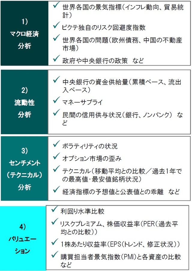 ピクテでは資産配分比率決定の分析ポイントとして4つの柱を用いています。その4つの柱は、1)マクロ経済分析、2)流動性分析、3)センチメント(テクニカル)分析、4)バリュエーションです。たとえば、株式の投資配分を決定するにあたってもすべての要素が常に株式のオーバーウェイトを同時に示すわけではありません。投資判断決定には、こうした異なる観点からの投資判断決定のポイントを勘案することが重要と考えています。