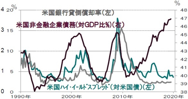 ※米国非金融企業債務(対GDP比%)、米国銀行貸倒償却率は2019年7-9月期まで