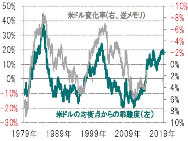※米ドルの均衡点からの乖離度は、貿易加重レートの過去のトレンドからの偏り