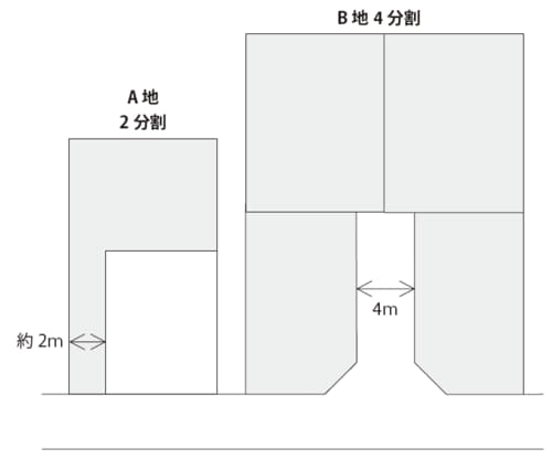 その典型が、下記図表1のA地のような路地状敷地による2分割、さらにはB地のように私道を造成した上での4分割です。