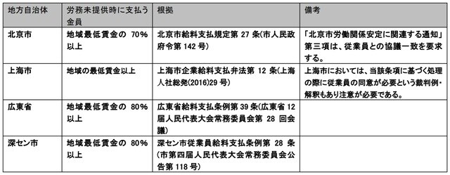 Q2で述べた本件5号通知第二項は後段で、賃金支払暫定規定(1995年施行)第12条と同内容の操業停止及び生産停止に関する規定を置いています。具体的には、企業が本件感染症事案の影響を受けて、1回の賃金支払期間※11を超えて操業停止又は生産停止となった場合において、労働者が通常の労働を提供しなかったときは、関連規定に基づき処理をしなければならないとされています。以下は、主な省又は直轄市の関連規定で定められた、操業停止又は生産停止時の労働者が自宅待機の場合に支払う金員の最低限度金額となります。