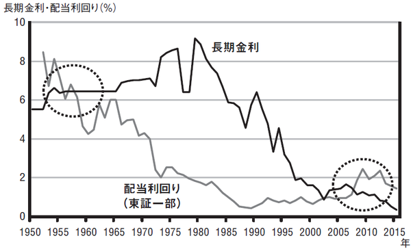 日本で初めて株式市場が作られた明治期から戦後しばらくまでの間、株式の配当利回りは極めて高く、長期債の利回りを上回ることも珍しくなかった。昔の投資家は、企業の成長よりも、毎年の配当を重視していたということになる。この流れが大きく変わったのが、1950年代である。