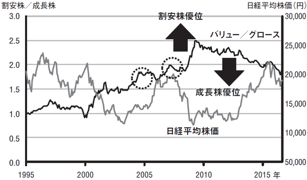 図表は日本における割安株指数と成長株指数の比率を示したグラフである。日本株は、バブル崩壊後、ずっと低迷が続いていたが、2003年を大底に、リーマン・ショックによってバブルが崩壊する2008年まで顕著な上昇を見せた。