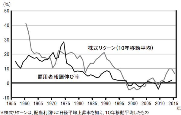 グラフの中で特徴的なのは、やはり、失われた20年と言われた1990年代以降の動きだろう。1997年から2004年にかけては、雇用者報酬の伸びを株式リターンが下回っている。この頃は、金融不安が最高潮に達し、日経平均株価が7000円台まで値下がりしていた。
