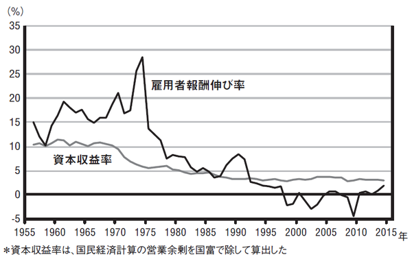 1955年から1990年頃までの間は、理論とは逆に雇用者報酬の伸びが資本収益率を上回っている。戦後の日本は高度成長が続いており、成熟経済とは正反対の状況だった。ピケティ理論は、近代化がかなり以前から進んでいた欧米経済を主な分析対象としているため、戦後の日本とは状況が違いすぎるのかもしれない。
