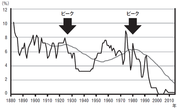 図表1は日本の長期的な公定歩合の推移を示したものだ。公定歩合は段階的に上下するので、30年の移動平均を使って平滑化したグラフも追加してある。
