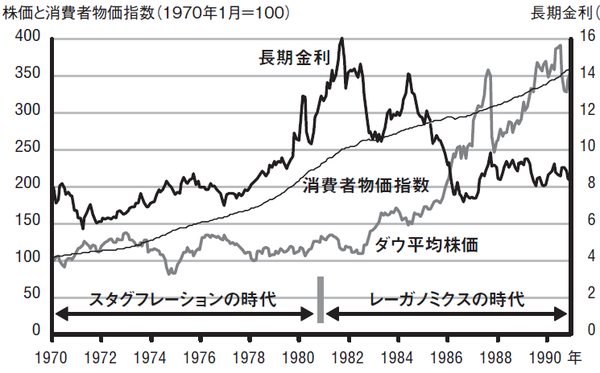 株式市場はこうした状況を如実に反映しており、ダウ平均株価は10年以上にわたって横ばいが続いていた。その間、インフレで物価は2倍になったことを考えると、実質的に株価は10年で半分の水準まで下落したことと同じである。米国経済は、まさに景気低迷とインフレのダブルパンチであった。