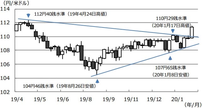 したがって、19日の円全面安は、「日銀の追加緩和期待」が、いくらか背景にあった可能性が高いと考えます。ドル円は現在、下値支持線と上値抵抗線からなる「三角保ち合い(もちあい)」を形成していますが(図表2)、今週、上値抵抗線をしっかりと上抜ければ、110円~115円のレンジ定着の可能性が高まります。ただ、追加緩和期待が剥落した場合、急速な円高方向の戻りも起こり得ますので、今しばらくは警戒が必要です。