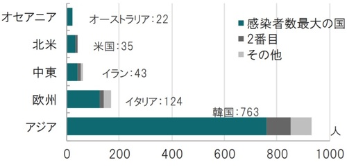 次に、新型コロナウイルスの感染が、中国や日本以外で拡大したたことも注目点です。足元、韓国やイタリア、さらに中東でも感染者が増えています(図表2参照)。世界保健機関(WHO)も新たな感染拡大への懸念を表明しています。一方で、感染源とされる中国では、新規感染者数の増加ペースは低下していますが、世界全体での感染拡大が足元ではより関心の高い懸念材料となっています。日本を含めた各国の感染拡大抑制策に今後の注目が集まりそうです。