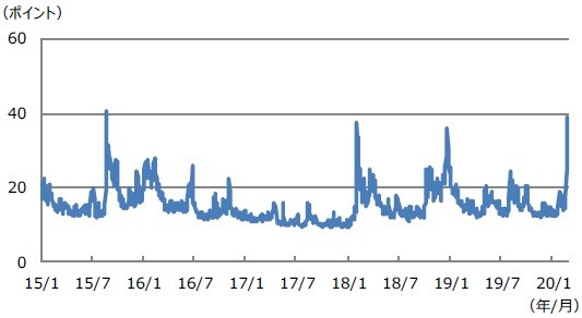 なお、米シカゴ・オプション取引所(CBOE)が、S&P500種株価指数のオプションの市場価格を基に算出する「VIX指数」は、一般に20を超えると投資家の不安心理が高まっていると解釈されます。2月27日時点のVIX指数は39を超え、人民元切り下げによるチャイナ・ショック(2015年8月)時の40超えに近づきました(図表1)。参考までに、2008年の金融危機当時のVIX指数は、80を超えていました(図表2)。