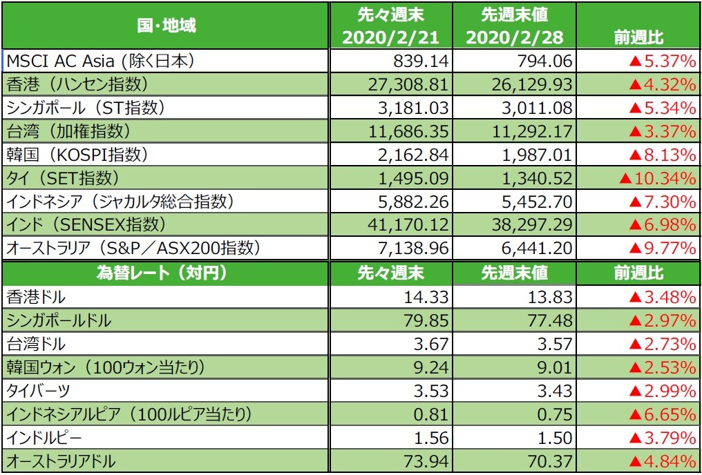 (注4)前週比は2020年2月21日から2020年2月28日まで、前月末比は2020年1月31日から2020年2月28日まで、前年末比は2019年末から2020年2月28日まで。