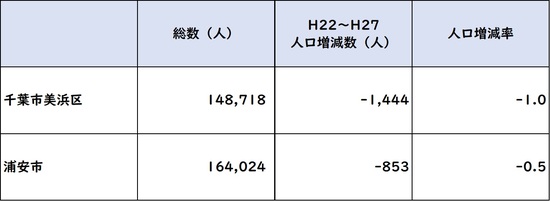 まず直近の国勢調査(図表1)を見てみる。千葉市全体の人口増加率は1.1%であるのに対して、美浜区は-1.0%を記録している。千葉市で人口減少を記録しているのは、ほかに「若葉区」(0.3%減)「花見川区」(1.0%減)の2区がある。また浦安市も0.5%減を記録。2011年の東日本大震災の際に、新浦安エリアの液状化現象が大々的に報道された。前回の国勢調査(2015年)の際には、その影響もあったのかもしれない。