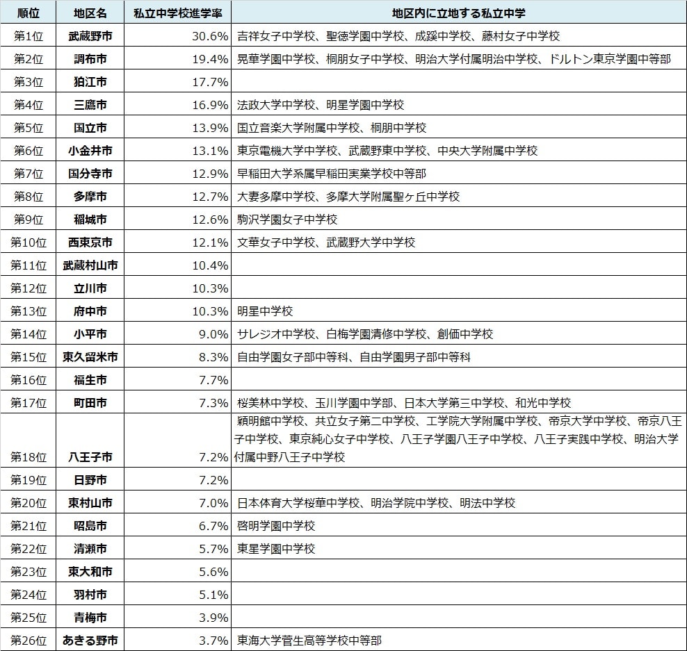 では東京市部では、どのような状況なのだろうか。東京都には26の市があるが、それらの私立中学校の進学状況を進学率順にみていこう。