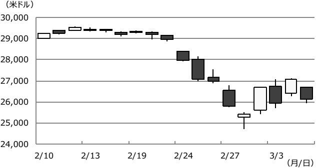 ダウ工業株30種平均は2月27日、前日比1,190ドル95セント安となり、1日の下げ幅としては過去最大を記録しました。一方、3月2日には前週末比1,293ドル96セント高となり、今度は1日の上げ幅として過去最大を記録しました。その後も、おおよそ1,000ドル幅で上昇と下落を繰り返すなど、総じて不安定な値動きが続いており(図表1)、日経平均株価もまた、振れ幅の大きい相場展開となっています。