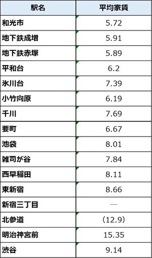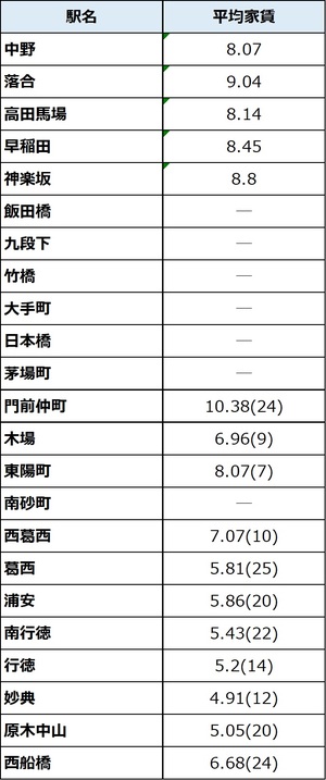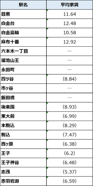 「目黒」を過ぎると、白金や高輪など都内でも高級住宅地で知られるエリアを通るため、平均家賃は高め。一方、都心を過ぎ、城東エリアに立地するエリアの家賃はリーズナブルであるが、今回のリサーチでは参照物件数が少なく、物件選びの際、選択肢が限られてくる可能性が高い。一方で、掘り出しものの物件が見つかるかもしれない穴場ともいえるだろう(図表9)。