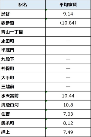 「渋谷」周辺の平均家賃は高めだが、都心を通り、「住吉」以降は7万~8万円台と、30代以降の会社員であれば視野に入る水準となる(図表8)。
