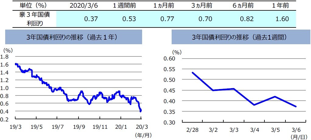 先週の豪州の3年国債利回りは、低下しました。新型肺炎の世界的な感染拡大によるグローバル景気の減速懸念に対応し、各国中央銀行が金融緩和への動きを強めました。豪州準備銀行(RBA)も3日、想定通り▲25bpの利下げを行いましたが、更なる追加利下げを織り込む形で利回りは一段と低下しました。